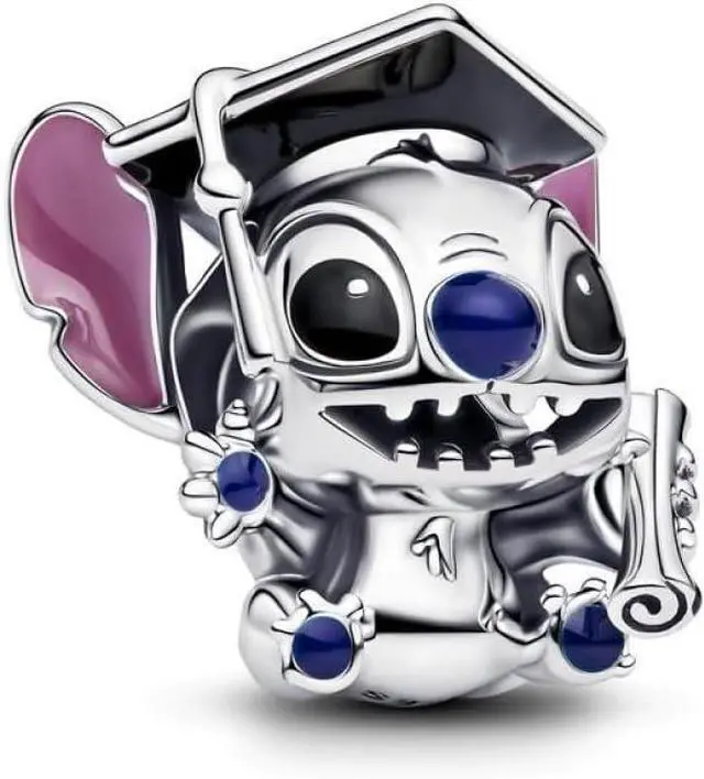Celebrate proud graduates with the Disney Stitch Graduation Charm. Made of sterling silver with colorful enamel details this charm is shaped like Disneys mischievous and endearing Stitch character dressed up with a graduation cap and scroll. Complete with two engravings - Proud and 2025 - this charm is inspired by Stitchs strength and courage and the idea that your ohana (family) always has your back.