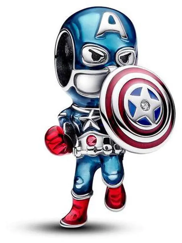Hold on to your hero with the Marvel The Avengers Captain America Charm. Crafted in sterling silver this charm depicts the iconic hero mid-action as if hes in the middle of an important mission. The figure is covered in hand-applied blue enamel and carries his trademark shield with a star symbol representing his love for the United States. This unique Marvel x Pandora Avengers charm stands for hope and leadership so wear it as a reminder of strength or gift it to the Marvel fan in your life.