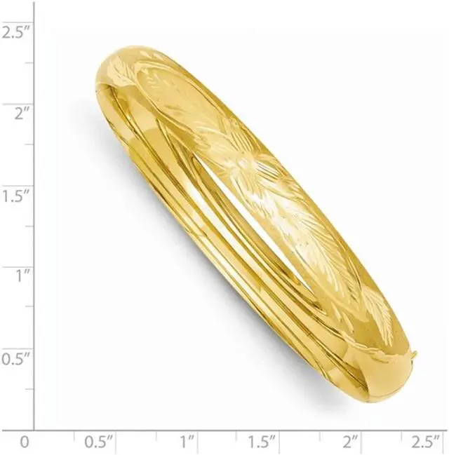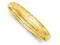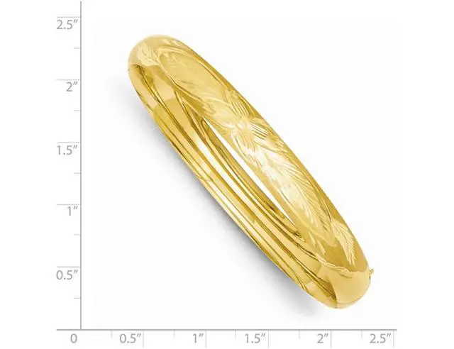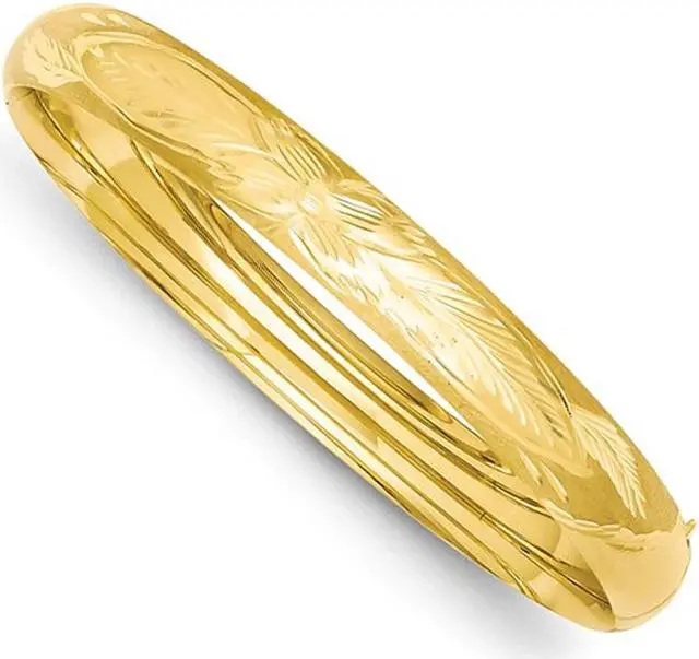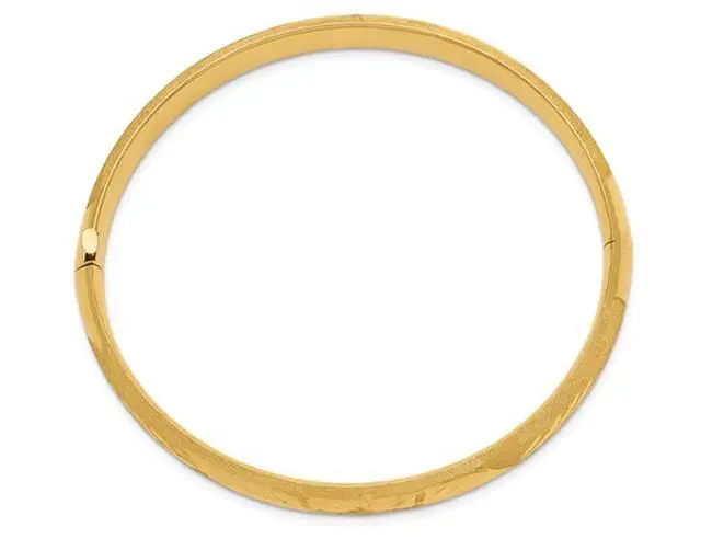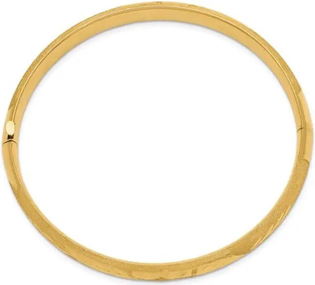 This classic bangle features a diamond cut satin finish in shimmering 14 karat yellow gold making this simple and elegant bracelet the one to have. This gold bangle weighs 9.25 grams.