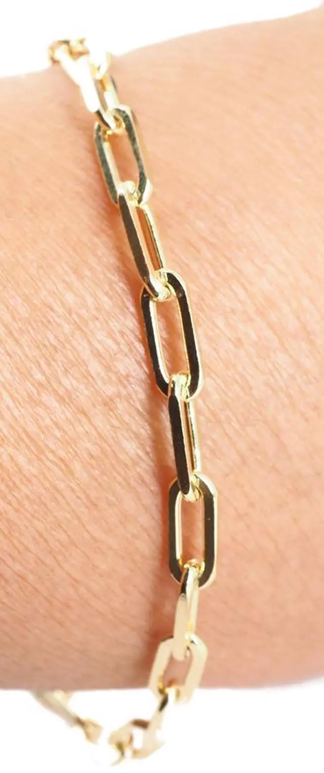 This elegant and versatile 8-inch bracelet features 4mm wide paperclip links crafted from genuine 0.925 sterling silver with a luxurious 14K gold plating.
