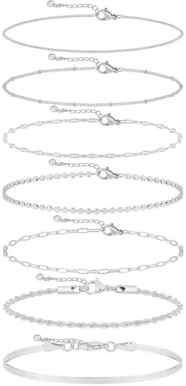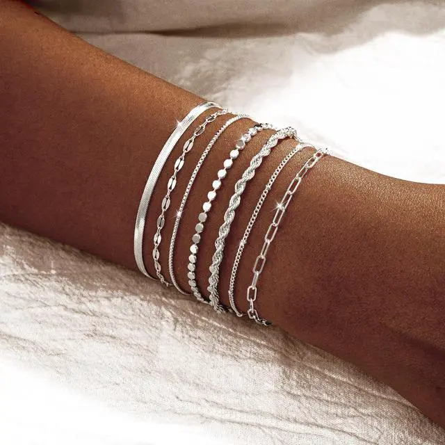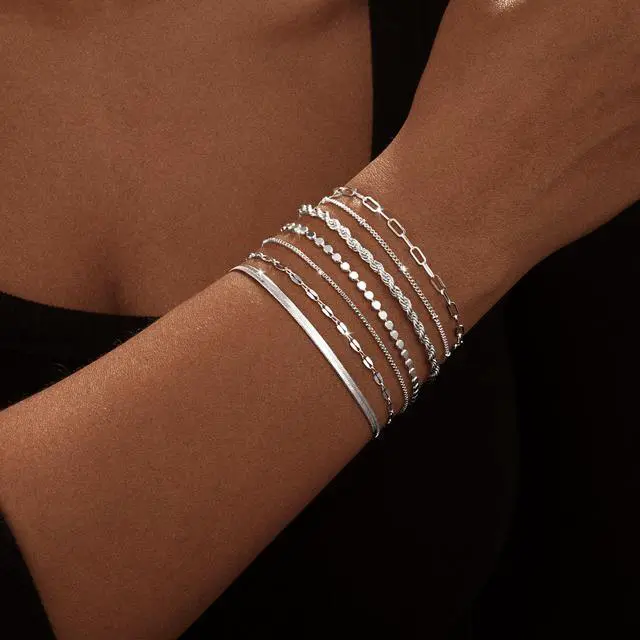 7pcs silver bracelets set : These silver stackable bracelets for women consists of 7 style chain bracelets.Set contains:satellite chain,box chain,paperclip chain,rope chain,lip chain,dot link chain,herringbone chain.Each dainty bracelet can be worn separately and you can also wear several chains at the same time, creating various styles and highlighting fashion and elegance.