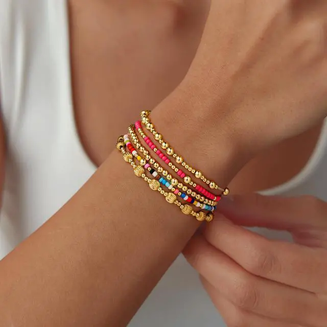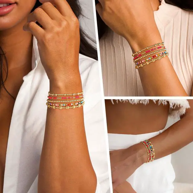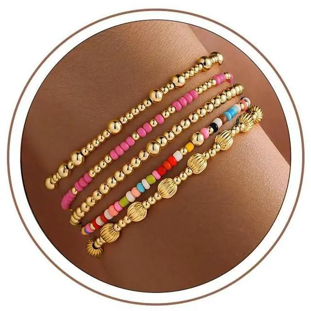 GOLD BRACELET SETS: 5PCS gold stackable bracelets for women, features 3 kinds of difference size beads (diameter: 3mm/4mm/6mm) and unique watermelon ball bead for effortless stacking. Each bracelet can be worn separately for minimalist or wear them together to create your own summer style