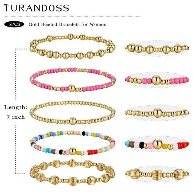 Mothers Day Gifts 5PCS Gold Beaded Bracelets for Women - Dainty 14K Gold Plated Bead Ball Bracelets for Women Colorful Beaded Stretch Bracelet Mothers Day Gifts for Mom Daughters