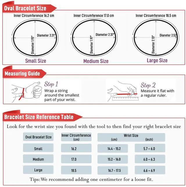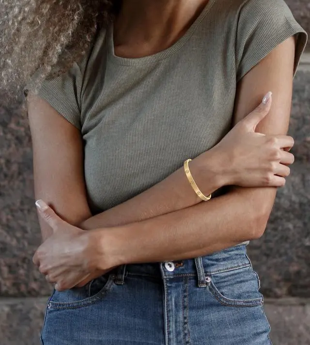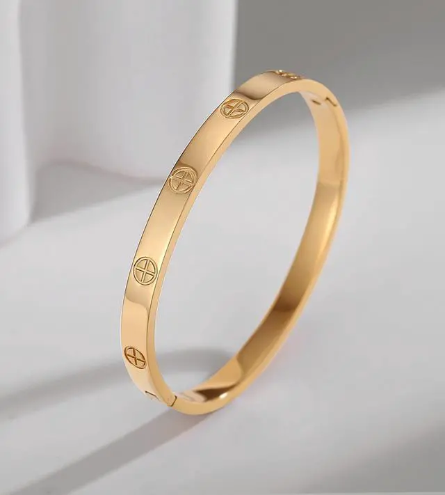 Ideal Size The inner circumference of the18K Gold-plated bracelet is 16.2cm, the width is 6 mm, and the inner diameter is approximately 2.21 X 1.93 inches, suitable for small wrist sizes from 5.7" to 6.0". In addition, this love bangle is not too heavy but also not too light, great everyday accessory to add a little style to your outfit. Tips: To determine your bracelet size, we advise that you measure the size of your wrist before purchasing.