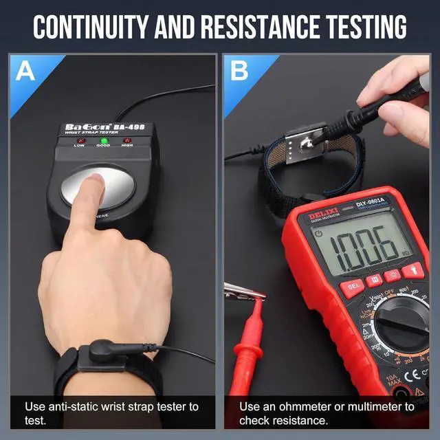 ESD Safety Tools: The purpose of the 1 megohm resistor is for safety: Anti static wristband can continuously discharge the static electricity from the human body through the built-in 1 M resistor to the ground, protecting your electronic components from accidental electrostatic discharge (ESD) damage during repairs. Made of 7 pure copper foil wires, which can eliminate static electricity within 0.1s, achieving a balance of charge between the hand and electronic devices