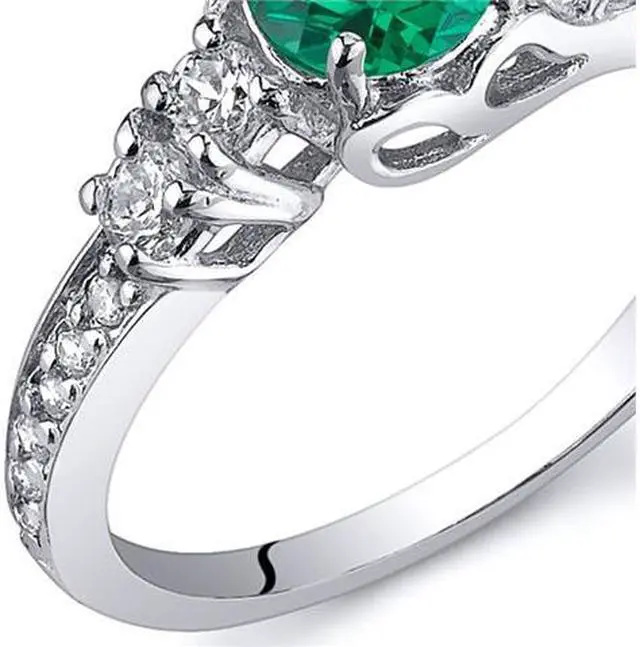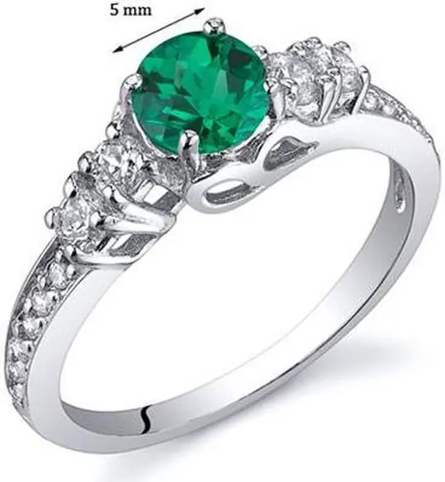 Center Stone: Lab Created Emerald, Round Shape with Checker Board Top, 5 mm diameter, 0.50 carats, Rich Forest Green Hue with Brilliant Sparkle. Side Stones: 16 pieces Super Sparkling Machine Cut White Cubic Zirconia. Ring: 2.90 grams, Pure Sterling Silver Rhodium Finish with .925 stamp, Ring features exceptional Design, Craftsmanship and Rhodium finishing. Perfect gift for Mothers Day, birthdays, Valentines Day, Graduation, Christmas or just about any other occasion. Includes a Signature Gift Box. Style SR10812