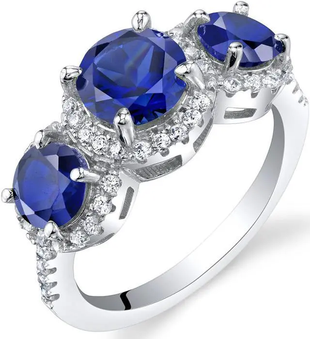 What a great way to honor your love! This ring features three lively blue stones – perhaps representing today, tomorrow and forever. Each created Blue Sapphire is wrapped in a halo of icy white Cubic Zirconia Cubic Zirconia accents that extend down the single shanks. Gorgeous handcut facets add lots of texture and character. Attractively boxed for easy gift giving.
