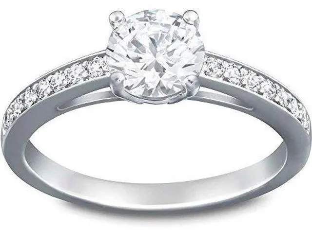Swarovskis Attract Round ring is a truly romantic gift. This stunning rhodium-plated ring features a round chaton in the centre with sparkling chatons on either side. The chatons embellish the front half of the ring. The perfect jewellery piece for day or evening outfits!. Size 58.