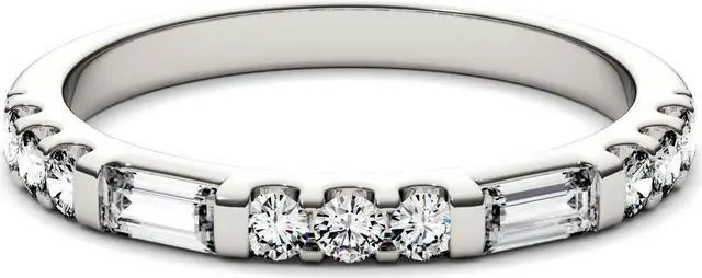 This elegant fashion ring showcases a 4x2mm straight baguette step cut Moissanite by Charles & Colvard gemstone. Beautifully crafted in rhodium plated 14K white gold and secured in a shared prong setting. Ring size 8. The Total Diamond Equivalent Weight (DEW) is 0.50cttw (Actual Weight 0.47cttw).