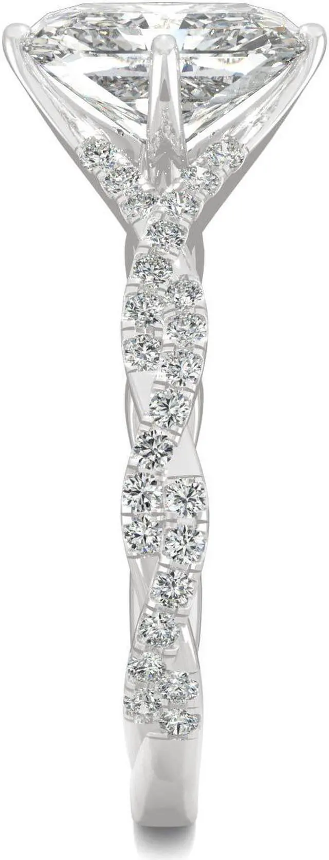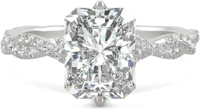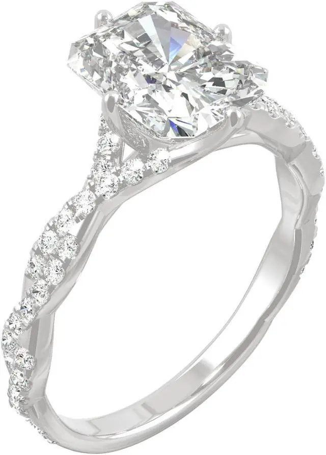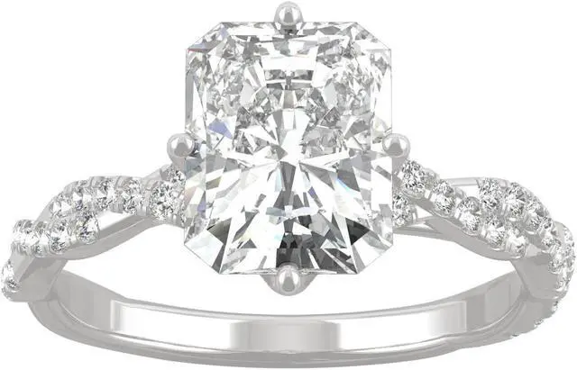 This elegant fashion ring showcases a 9x7mm radiant cut Moissanite by Charles & Colvard gemstone. Beautifully crafted in rhodium plated 14K white gold and secured in a four prong setting. Ring size 9. The Total Diamond Equivalent Weight (DEW) is 3.10cttw (Actual Weight 2.76cttw).