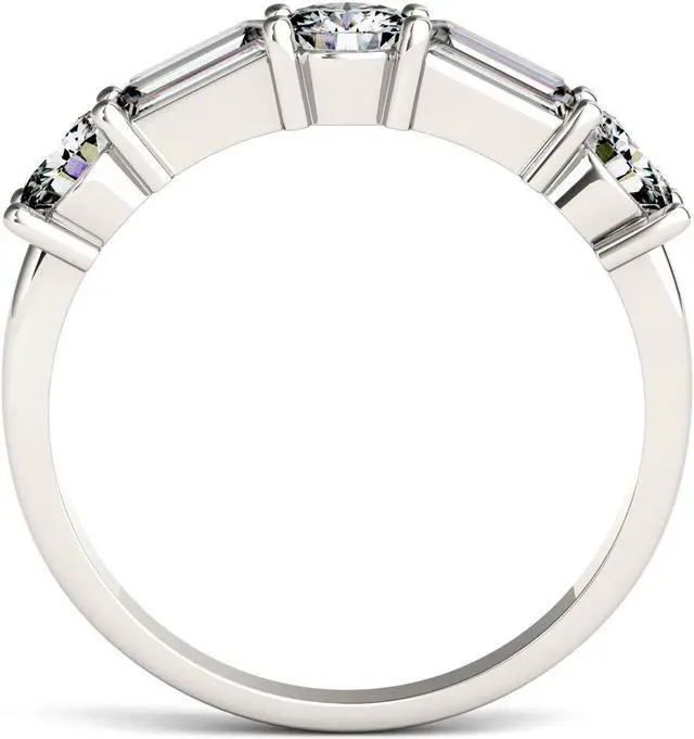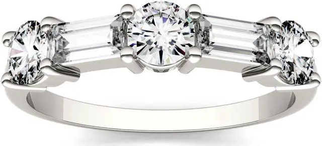 This elegant fashion ring showcases a 5x2mm straight baguette step cut Moissanite by Charles & Colvard gemstone. Beautifully crafted in rhodium plated 14K white gold and secured in a four prong setting. Ring size 5.5. The Total Diamond Equivalent Weight (DEW) is 1.15cttw (Actual Weight 1.06cttw).