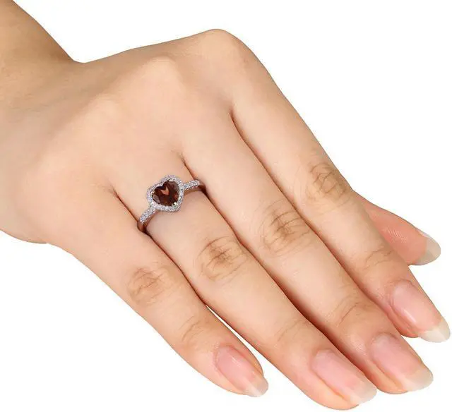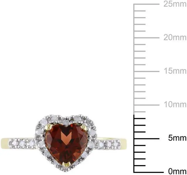 A stunning heart shaped rich red garnet gemstone the birthstone of January is supported by sparkling accent diamonds in a shimmering 10 karat yellow gold foundation brings this promise heart ring to life.
