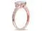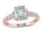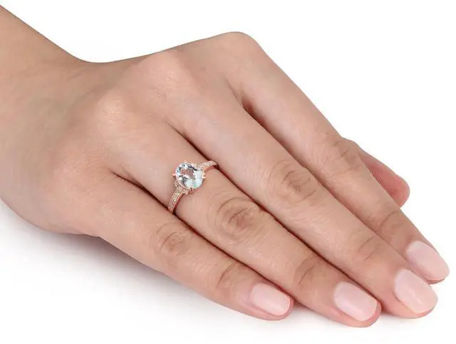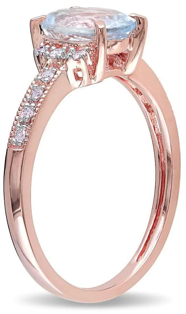 A stunning oval-cut clear-light aquamarine sits at the center of this rose pink plated sterling silver ring. The March featured birthstone is supported on both sides by sparkling accent diamonds.