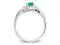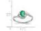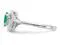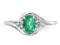 A solitaire oval shaped natural green emerald gemstone 2/5 carat (ctw) sits in a crisp 14 karat white gold foundation while 6 sparkling accent single cut diamonds support the beautiful gemstone.
