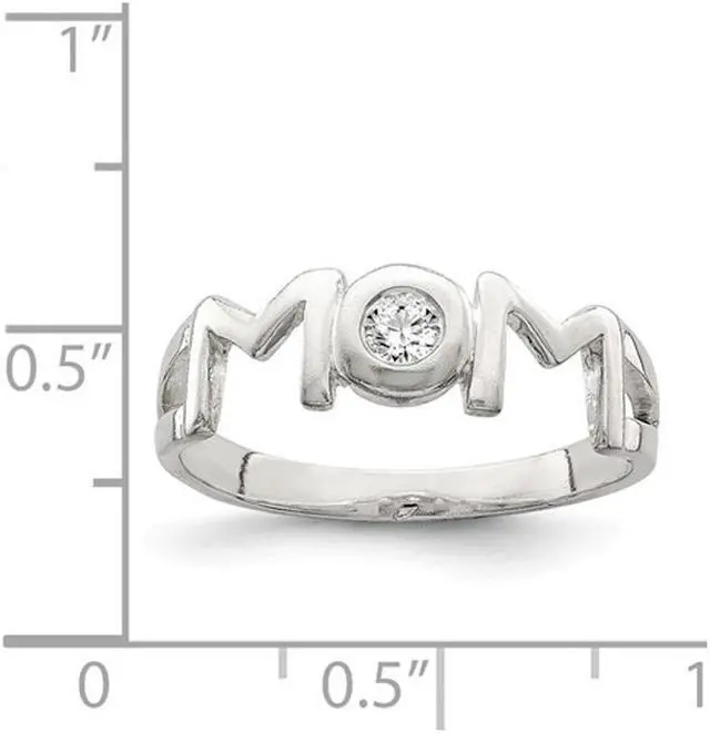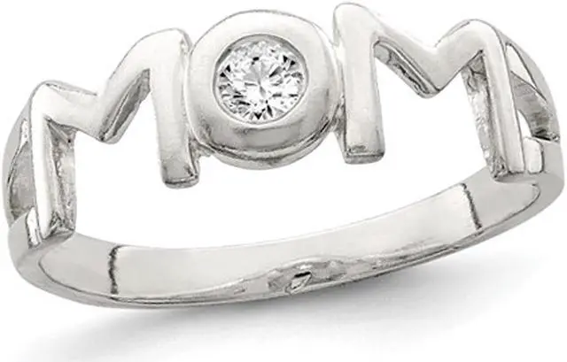 A simple and elegant ring crafted from sleek sterling silver with the word MOM created as its focal point and a sparkling cubic zirconia at its center. Part of the Gem & Harmony Exclusive Mother and Moms Collection.