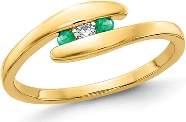 Twp Stunning natural green emerald gemstones 1/20 carat are set in 14 karat yellow gold with a single brilliant round diamond between them in this delightful promise ring. This item features the birthstone for May.