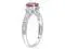 This stunning engagement fashion ring is crafted from gleaming 10 karat white gold. The three stone motif includes a pretty pink lab-created sapphire at its center supported by two stunning lab created white sapphire gems on both sides while sparkling diamonds complete the look.