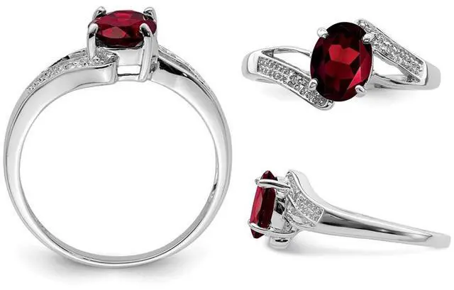 A beautiful oval shaped rich red garnet gemstone 1.30 carats (ctw) is prong set in sleek sterling silver making this stunning ring the featuring the birthstone of January the perfect match to any outfit. Tiny accent diamonds complete the look on either side.