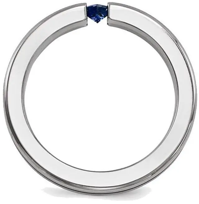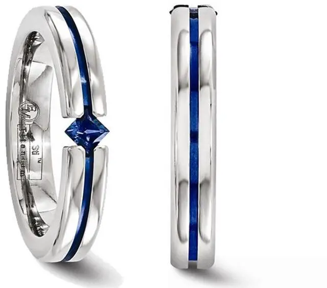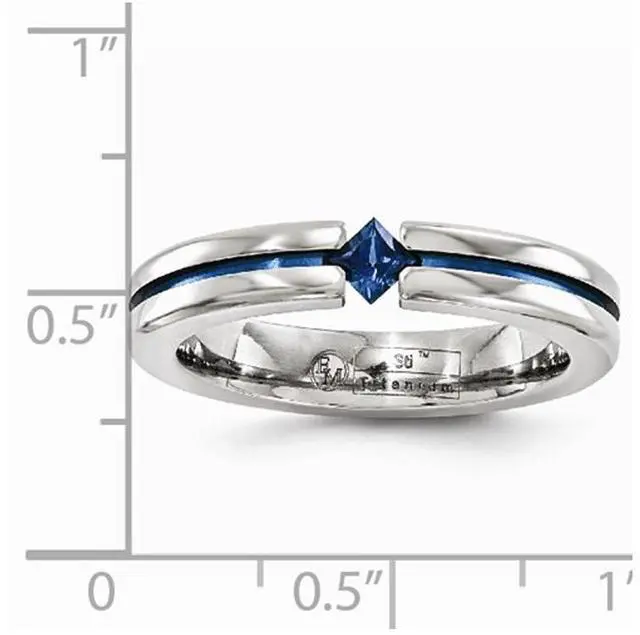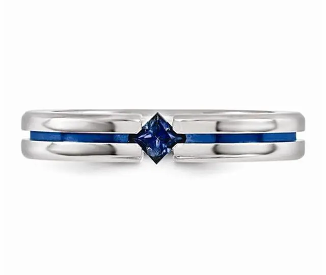 A single princess cut natural blue sapphire gem the birthstone for September is bezel set in the center of this strong Titanium band with a blue anodized streak in the band. This grooved 4mm band is the perfect and elegant gift he will love.