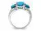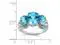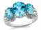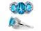 An Oval cut shaped swiss blue topaz gemstone is supported by two additional oval-cut blue topaz gemstones, in the embrace of crisp rhodium plated sterling silver in this attractive gemstone ring featuring the birthstone of December.