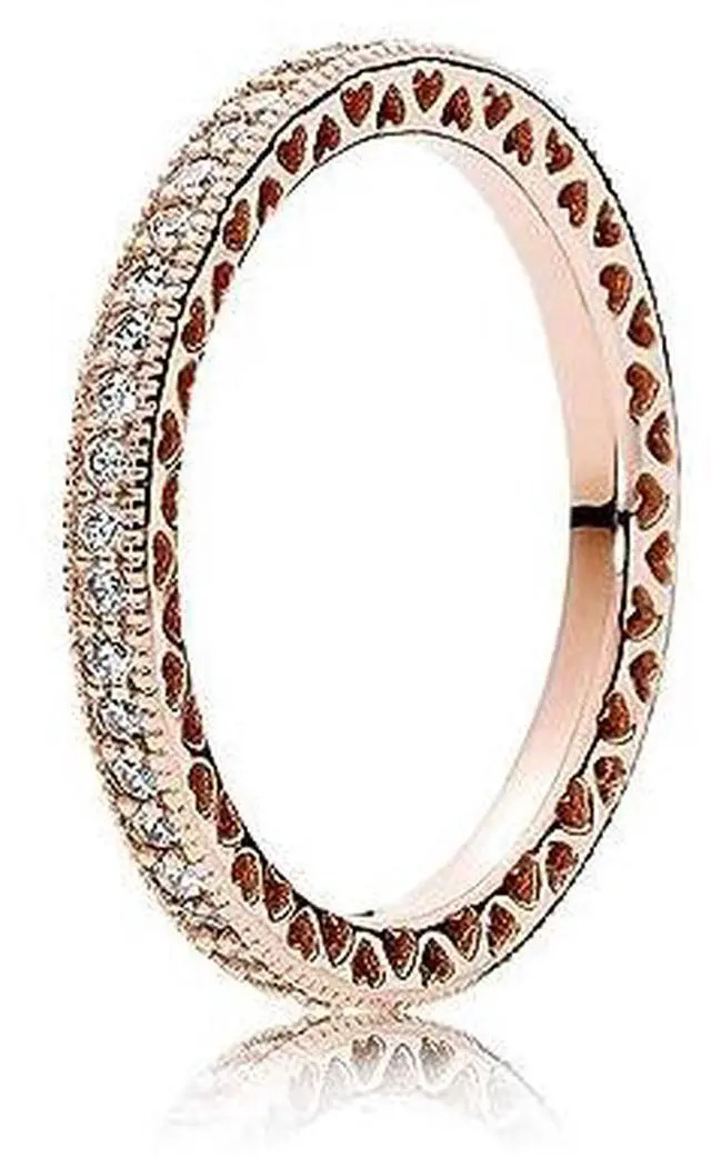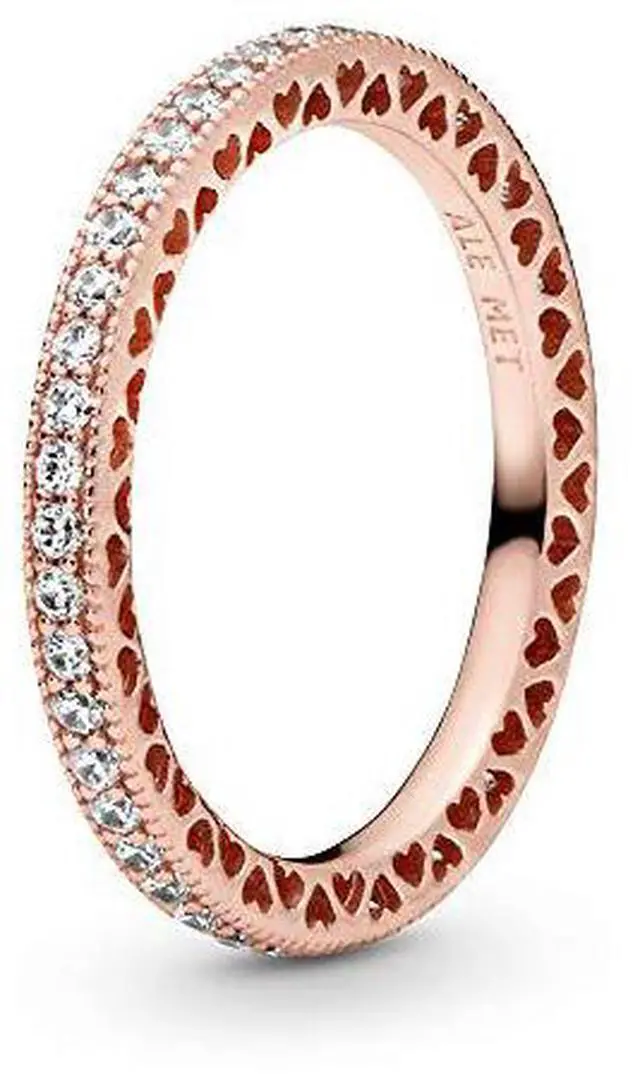 Express your hearts true desire with this sparkling eternity ring. Hand-finished in Pandora Rose a 14k rose gold-plated unique metal blend this elegant style beautifully combines dazzling cubic zirconia stones with delicate cut-out hearts. Showcase it on its own or mix and match with other Pandora stackable rings for a chic play on textures.
