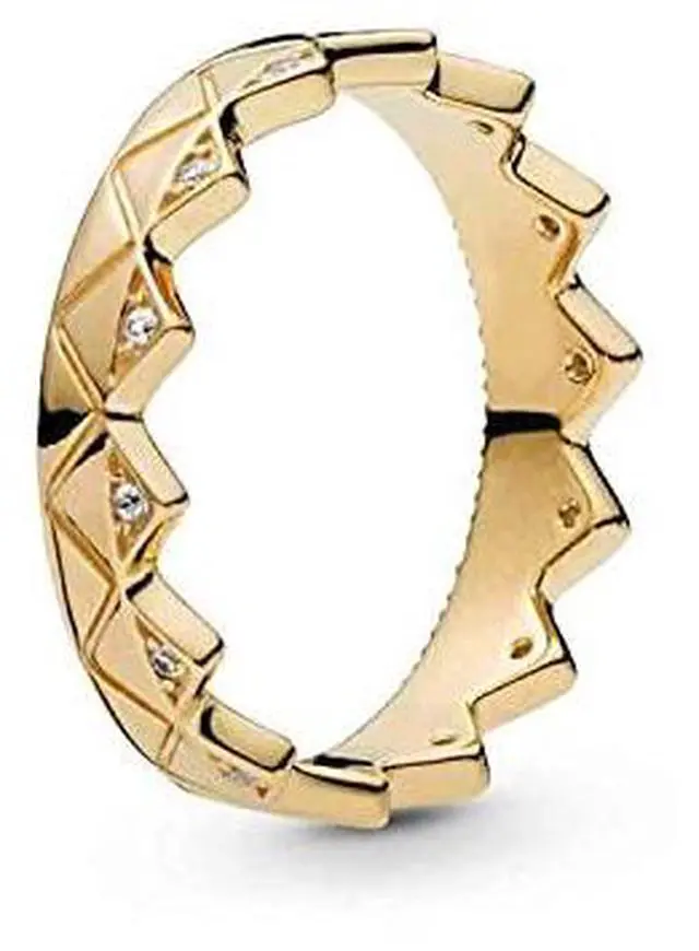 This 18k gold-plated sterling silver crown ring brings graphic appeal to fingers with its zig-zag edge and engraved pattern sparkling cubic zirconia stones and milgrain detailing. The bottom edge of the Pandora Shine piece is detailed with raised hearts - an enduring symbol of Pandora. Slot two together point to point or wear multiples including the corresponding crown ring in sterling silver for a mixed metal look.