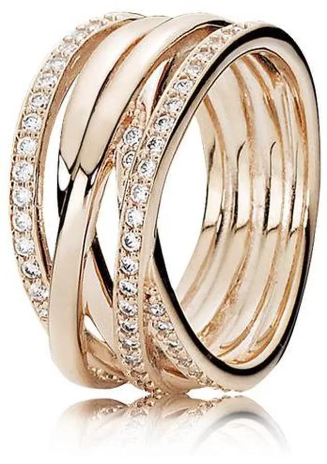 Let your individuality shine with this Sparkling & Polished Lines Ring. In a 14k rose gold-plated finish this sophisticated and contemporary design entwines rows of polished metal with rows of shimmering cubic zirconia stones. This statement style can be worn on its own as a chic cocktail ring or together with other Pandora rings.