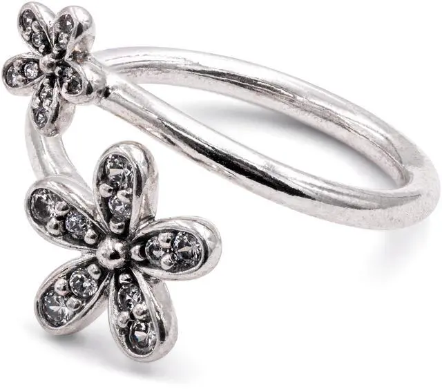 Style a modern floral look with this exciting and elegant hand-finished ring in sterling silver. The open design features two glittering daisies.