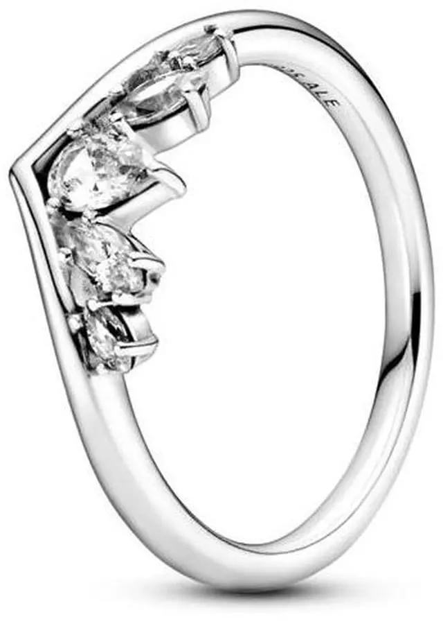 For a delicate sophisticated piece look to the Sparkling Pear & Marquise Wishbone Ring. Hand-finished in sterling silver the design of this wishbone ring references the aesthetic of the Pandora Wish collection. Featuring clear cubic zirconia in a range of shapes claw-set inside the V-shape of the ring the stones give the appearance that they are floating. Stack this ring with other sterling silver pieces from Pandora for a subtle unified look.