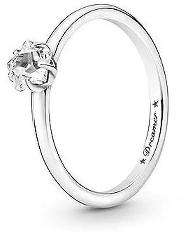 Bring starry sparkle to your outfits with the Celestial Sparkling Star Solitaire Ring. Inspired by celestial beauty the sleek sterling silver ring features a center star-shaped clear cubic zirconia stone and is complemented by two asymmetric stars and the word Dreamer engraved inside the shank. The dazzling design looks equally stunning worn on its own or layered with contrasting Pandora rings in different metal tones. A classic and sophisticated addition to any collection.