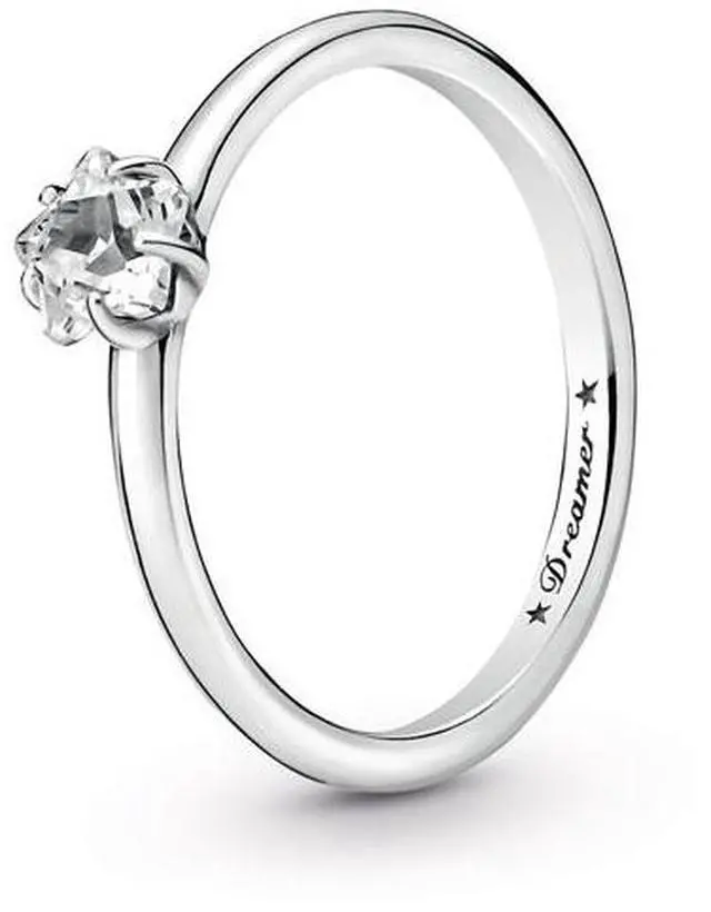 Bring starry sparkle to your outfits with the Celestial Sparkling Star Solitaire Ring. Inspired by celestial beauty the sleek sterling silver ring features a center star-shaped clear cubic zirconia stone and is complemented by two asymmetric stars and the word Dreamer engraved inside the shank. The dazzling design looks equally stunning worn on its own or layered with contrasting Pandora rings in different metal tones. A classic and sophisticated addition to any collection.