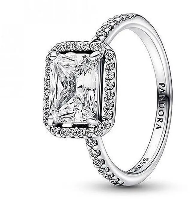 This stunning vintage-inspired ring is one you will treasure forever. Crafted in sterling silver this sophisticated Pandora Timeless ring is embellished with a halo of sparkling cubic zirconia stones and features a large rectangular radiant-cut stone as a stand-out centerpiece. Wear it on its own as a statement cocktail ring or style it with contrasting Pandora rings for a fresh contemporary look.