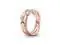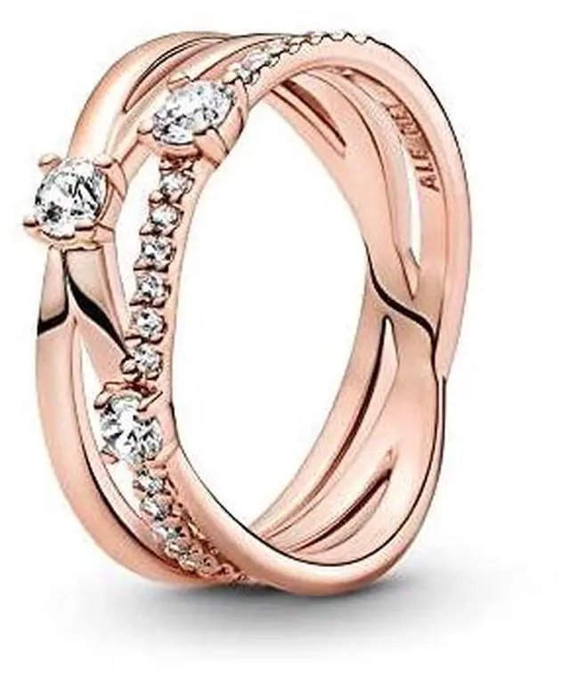 For a classic touch go for the Sparkling Triple Band Ring. Hand-finished in 14k rose gold plating this style features three interlinked rings. Small clear cubic zirconia decorate the top of one ring shank while three bigger stones are set across all three for extra sparkle. As this wide-band ring has a pre-stacked look teaming it with other shimmering Pandora Timeless rings will make a bold statement.