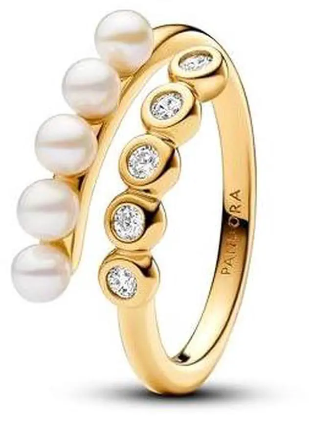 Elevate your outfit with our Treated Freshwater Cultured Pearls & Pave Open Ring plated with 14k gold. A chic fusion of elegance and modern open design this unique ring features a row of pearls on one end and a Pave of sparkling stones on the other. The Pandora logo discreetly engraved inside adds a touch of authenticity. Inspired by the timeless allure of pearls and the play of textures this ring is a true statement piece. Please consider that this ring is not size adjustable and any attempt to open bend or squeeze it may result in damage.