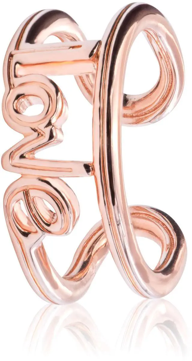 Wear your love loud and proud everywhere you go with this Pandora ME Love Open Ring. Hand-finished this 14k rose gold-plated link is emblazoned with the word love in a handwritten font on a continuous line design that leads into the ring band. Style yours to represent the love for your family your best friends or your love for yourself. Add significance to your looks by adding this statement ring into your everyday stacks. Please note- attempting to reshape the open band yourself will damage your ring.