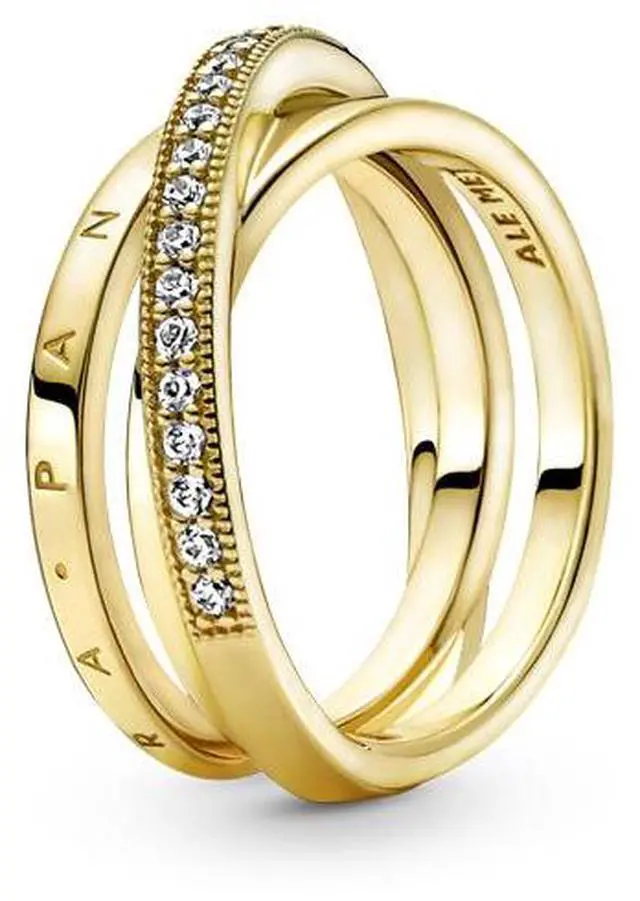 Go for linear layers with the Crossover Pave Triple Band Ring. Hand-finished in 14k gold plating this ring features three bands with one diagonally overlapping the other two. One inner band is embossed with the Pandora logo the other inner band is polished and the outer band features clear cubic zirconia pave framed by micro-beading. Inspired by the mesmerising structure of the solar system this ring brings sleek structural sophistication to any look.