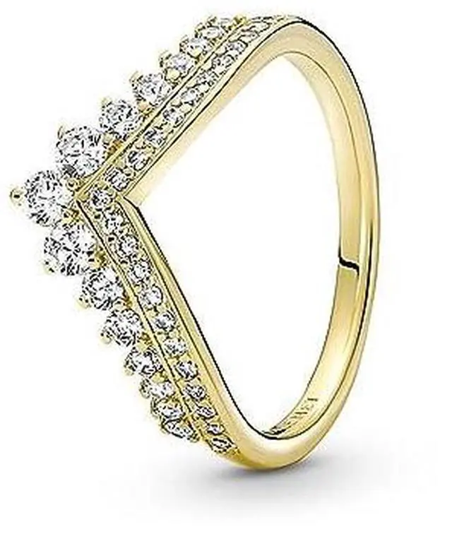 Let even more radiance into your ring styling with this glittering tiara ring fit for a modern-day princess. Inspired by royal headpieces from across history this 14k gold-plated wishbone ring will add a regal feel to your everyday looks. Set with rows of glittering cubic zirconia in classic settings the chevron-shaped piece is sure to be the crowning glory in any ring stack.