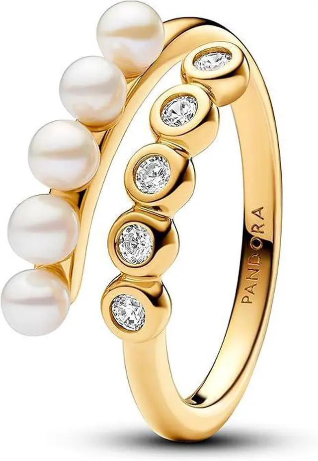 Elevate your outfit with our Treated Freshwater Cultured Pearls & Pave Open Ring plated with 14k gold. A chic fusion of elegance and modern open design this unique ring features a row of pearls on one end and a Pave of sparkling stones on the other. The Pandora logo discreetly engraved inside adds a touch of authenticity. Inspired by the timeless allure of pearls and the play of textures this ring is a true statement piece. Please consider that this ring is not size adjustable and any attempt to open bend or squeeze it may result in damage.