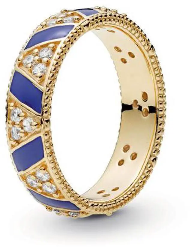 Make a bold statement with this 18k gold-plated sterling silver ring inspired by the graphic lines of triangles. The Pandora Shine design features an exotic pattern of carefully clustered stones and hand-painted enamel stripes in clematis blue. The stackable ring is finished with milgrain edges. Wear with other band rings or style alone as a stand-out statement to show it off to full effect.