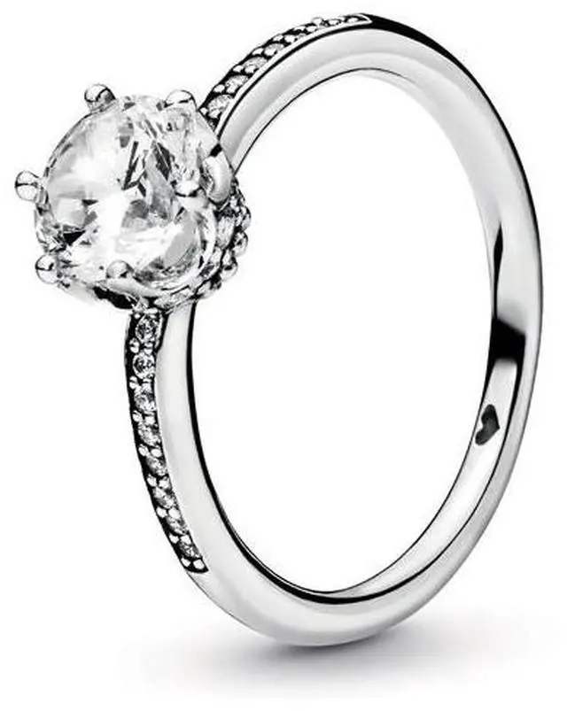 Bring an explosion of sparkle to your outfits with the sterling silver Clear Sparkling Crown Ring. The claw setting of the large clear cubic zirconia creates the effect of a regal crown on the solitaire ring and is complemented by additional small stones set along the ring band. A ring thats fit for the special princess or queen in your life it can be paired with most other selections from the Pandora collection for a truly regal look.
