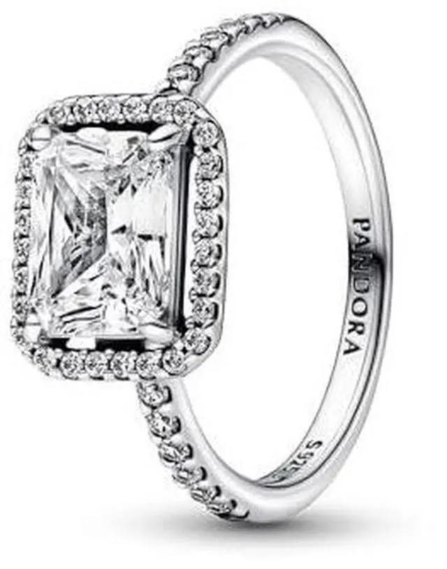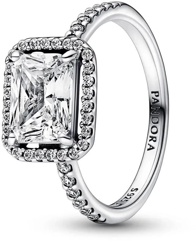 This stunning vintage-inspired ring is one you will treasure forever. Crafted in sterling silver this sophisticated Pandora Timeless ring is embellished with a halo of sparkling cubic zirconia stones and features a large rectangular radiant-cut stone as a stand-out centerpiece. Wear it on its own as a statement cocktail ring or style it with contrasting Pandora rings for a fresh contemporary look.