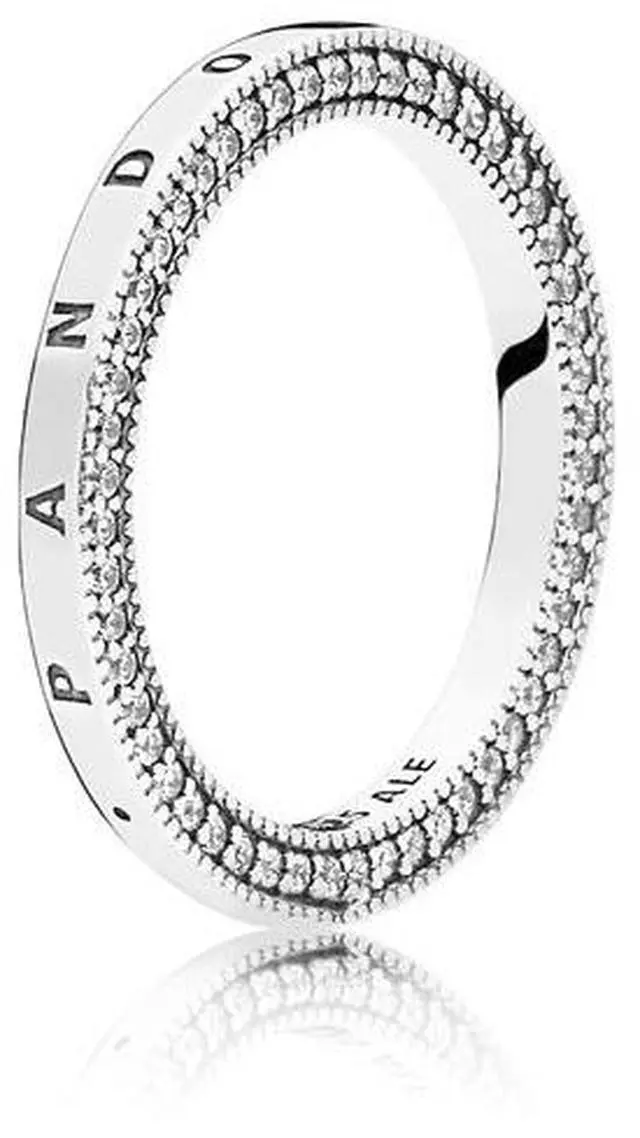 This sterling silver ring is embellished with a PANDORA logo cut-out hearts and shimmering cubic zirconia. Stack to accentuate either the stone-studded side or the heart details.