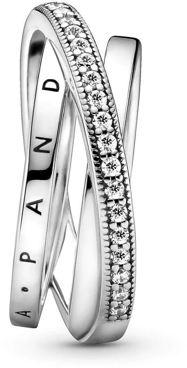 Go for linear layers with the Crossover Pave Triple Band Ring. This Sterling Silver ring features three bands with one diagonally overlapping the other two. One inner band has the Pandora logo the other inner band is polished and the outer band features clear cubic zirconia pave framed by micro-beading. All three bands merge at the back of the ring shank. Inspired by the spiral structure of the solar system this ring brings a sleek structural sophistication to any look.
