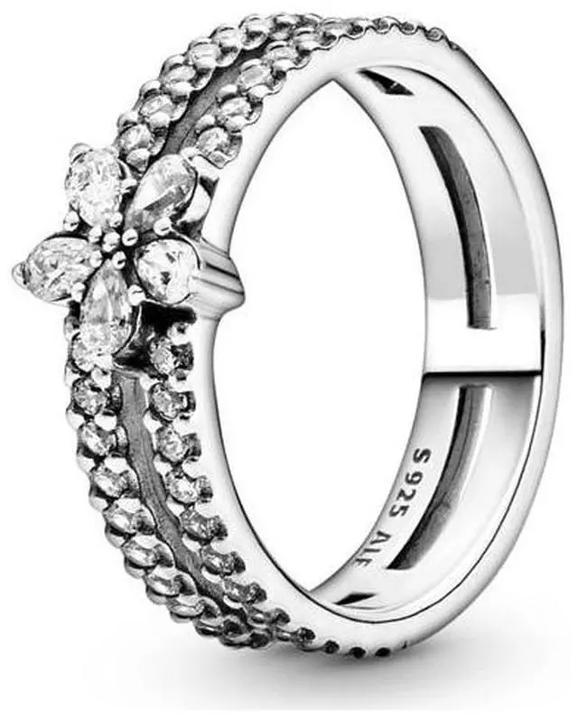 Let it snow with the Sparkling Snowflake Double Ring. Hand-finished in sterling silver this piece is inspired by the magic of the holidays. A glittering star-like snowflake formation sits on top of this double ring design with the two rings joined together at certain points along the bands. Clear stones in various sizes decorate half of the ring shank. Feel extra festive by styling this ring with corresponding earrings in sterling silver.