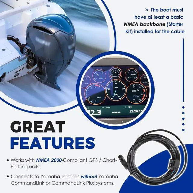 Great Features 4-Pin Data Connector. Works with NMEA 2000-Compliant GPS / Chart-Plotting units. Connects directly to the NMEA 2000 connector under the engine's cowling. Connects to Yamaha engines without CommandLink or CommandLink Plus systems. The boat must have at least a basic NMEA backbone (Starter Kit) installed for the cable to interface with the GPS unit