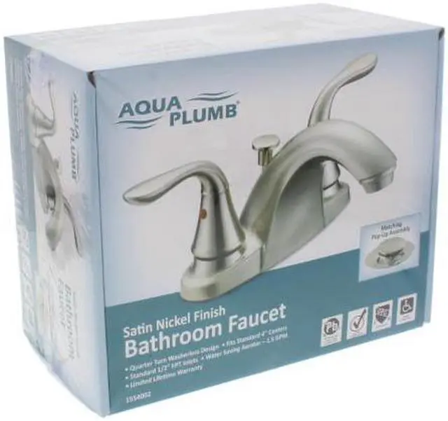 Featuring an elegant swan-style neck and a built-in pop-up drain, this AquaPlumb Bathroom Faucet brings a touch of style to any modern bathroom. This sink faucet features a swan neck that arches over the center of your sink, expanding the space available under the faucet, so you can easily fill a glass of water or wash your face with space to spare. The two-handle construction allows you to control the hot and the cold water individually, so you can tailor the temperature of the water to your preference. The bathroom faucet pop-up drain is located on the back of the faucet in between the handles.