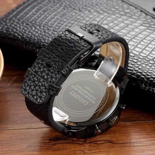 1. Fashionable large dial, quartz movement, concise style mens wrist watch. 2. Leather band and alloy case. 3. With GMT time, calendar and luminous display functions. 4. Clasp type: buckle. 5. Built-in battery.