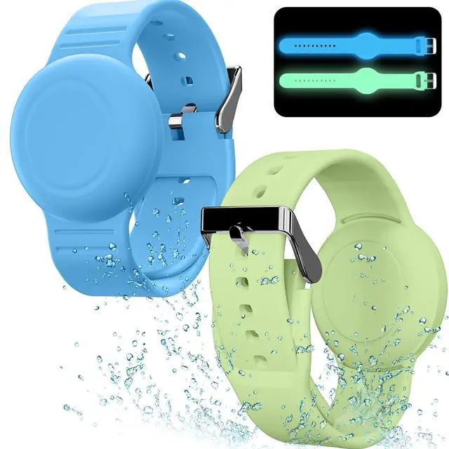Waterproof Bracelet Compatible with Airtag (1st & 2nd Gen) for Kid, 2 Pack Soft Silicone Hidden Wristband, Lightweight Watch Band for Child, Grow in Dark Blue & Green