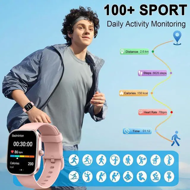 110+ Fitness Modes and IP68 Waterproof: The fitness tracker provides over 110 sports modes, covering a wide range of activities to meet different user preferences. It records data during workouts such as heart rate, steps, calories burned, distance, and active hours in real time. The device is IP68 waterproof, allowing use during outdoor activities, rainy days, and handwashing (Note: Do not use in showers, saunas, swimming, etc.).