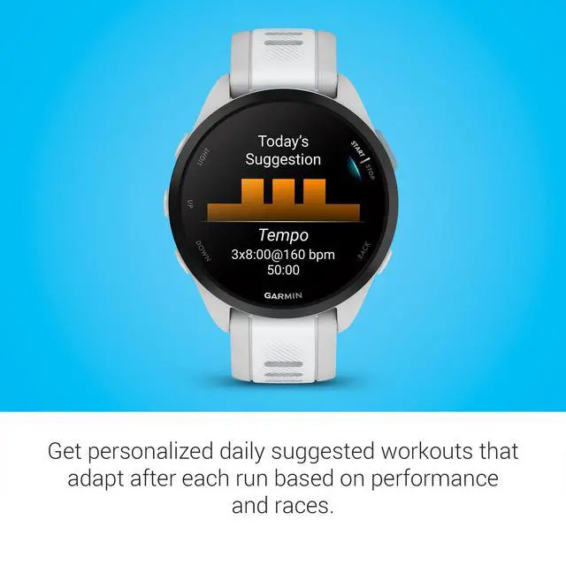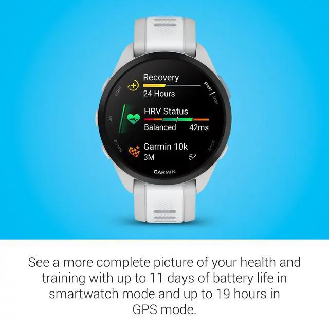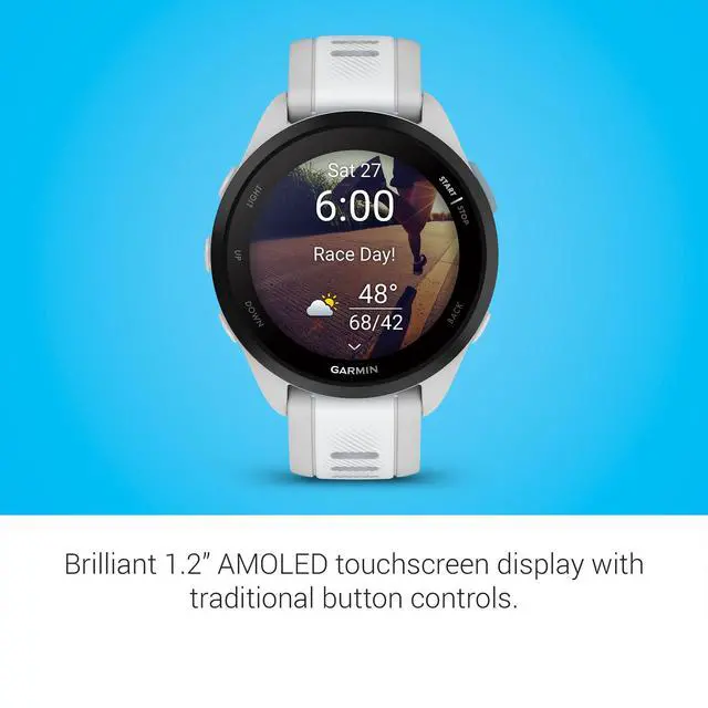 Go ahead sign up for that race, and train brilliantly with the easy-to-use Forerunner® 165 GPS running smartwatch. With pace, distance and heart rate, youll see your progress shine on the watchs AMOLED touchscreen display while JAYSUING Coach and race adaptive training plans help you chase your goals. Wake up to your morning report to see health insights alongside an overview of sleep, recovery and training outlook (data presented is intended to be a close estimation of metrics tracked). Use training effect and training effect labels to see how your workouts impact your fitness and to understand the primary benefit achieved from your workout. Then, check recovery time to know how long to take it easy between runs. Pair your watch to your smartphone, and your notifications will show up right on your wrist. Get a more complete picture of your health, not just a glimpse, from your Forerunner 165 smartwatch, with up to 11 days of battery life in smartwatch mode.